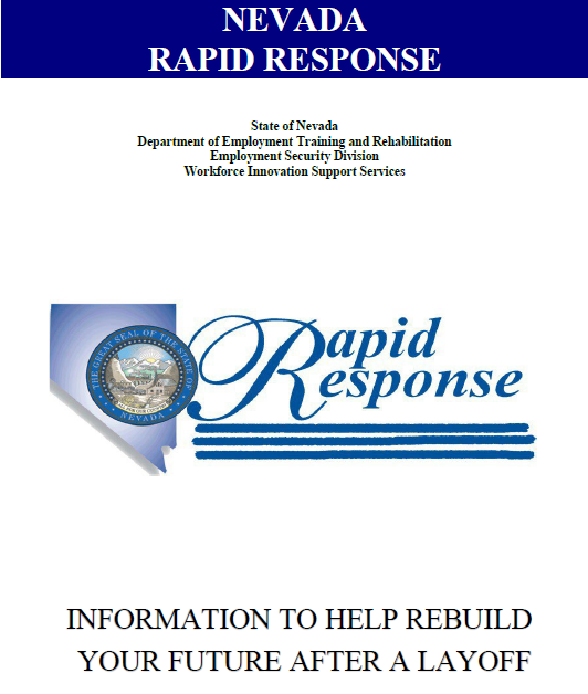 Rapid Response is a team of professionals from public and private sectors whose specialty is helping individuals who may be facing the prospect of unemployment. This team directs you to a variety of services that can help make your transition into your next opportunity less stressful. For example, you may be eligible for job search and resume’ building workshops, career counseling, or learn about union apprenticeship programs that will enhance your ability to quickly return to work. The Rapid Response team also provides financial information and resources to assist you during your transition. This Rapid Response information booklet will provide you with information on these subjects and others such as EmployNV Career Hub centers and Unemployment Insurance for your reference.